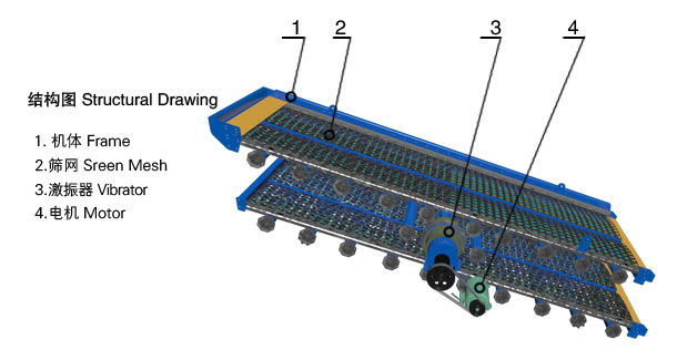 電動機經(jīng)三角帶使激振器偏心塊產(chǎn)生高速旋轉(zhuǎn)。運轉(zhuǎn)的偏心塊產(chǎn)生很大的離心力,激發(fā)篩箱產(chǎn)生一定振幅的圓運動,篩上物料在傾斜的篩面上受到篩箱傳給的沖量而產(chǎn)生連續(xù)的拋擲運動,物料與篩面相遇的過程中使小于篩孔的顆粒透篩,從而實現(xiàn)分級。