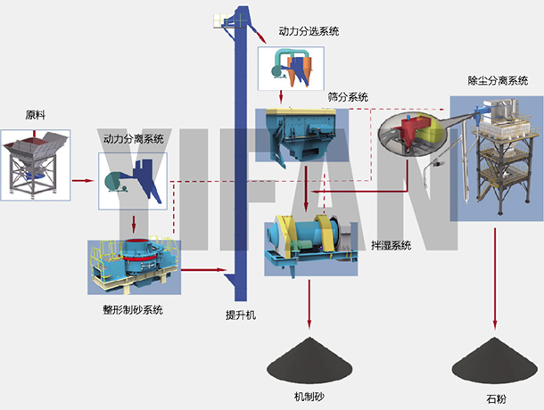 SSF系列制砂樓生產(chǎn)工藝采用干法生產(chǎn),包括給料、破碎與機(jī)制砂整形、級配調(diào)整、篩分、砂粉分離、粉塵收集、輸送、電氣控制、拌濕等工作模塊。