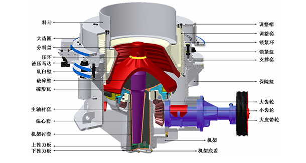 CCH系列液壓圓錐破碎機(jī)工作時,由電動機(jī)通過三角帶、主機(jī)帶輪、傳動軸、小錐齒輪、大錐齒輪帶動外銅旋轉(zhuǎn),破碎圓錐軸心線在外銅的迫動下做旋轉(zhuǎn)擺動,使得破碎壁表面時而靠近又時而離開軋臼壁的表面,從而使物料在定錐與動錐組成的環(huán)形破碎腔內(nèi)不斷地受到?jīng)_擊、擠壓和彎曲而破碎。經(jīng)過多次擠壓、沖擊和彎曲后,物料破碎至要求粒度,經(jīng)下部排出。