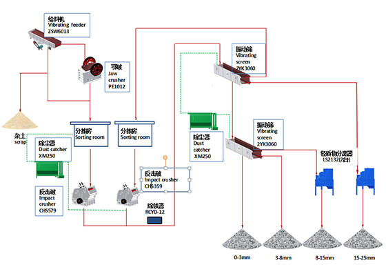 主要設(shè)備:反擊式破碎機(jī)、振動(dòng)給料機(jī)、圓振動(dòng)篩、輕物質(zhì)分離器、除鐵器等。