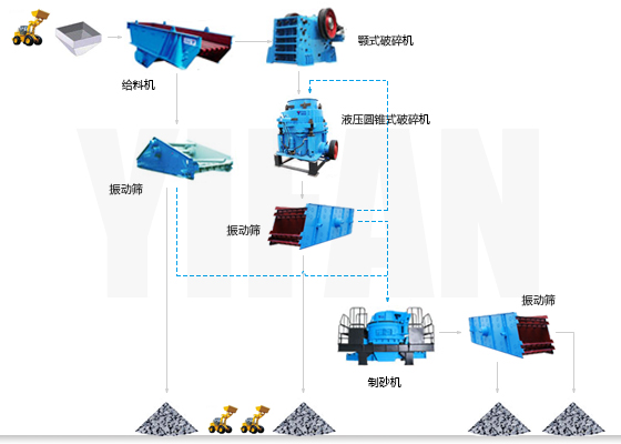 石料由振動(dòng)給料機(jī)均勻地送到顎式破碎機(jī)進(jìn)行粗破,粗破后的物料由膠帶輸送機(jī)送入到粗碎圓錐破進(jìn)行進(jìn)一步破碎,破碎后的物料被輸送到振動(dòng)篩進(jìn)行篩分,達(dá)到成品粒度要求的物料通過(guò)膠帶運(yùn)輸機(jī)輸送到成品料堆;未達(dá)到成品粒度要求的物料從振動(dòng)篩返回中碎或細(xì)碎圓錐破加工,形成閉路循環(huán)。成品粒度可按用戶的需求進(jìn)行組合和分級(jí)。