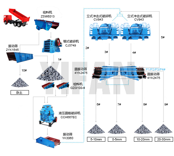我國玄武巖資源眾多,因地而異。因此在配置設(shè)備時(shí),要把方案的耐磨性性放在主要位置。 以200mm以下玄武巖為例:物料在原料倉經(jīng)由給料機(jī)、皮帶機(jī)輸送至1#振動(dòng)篩進(jìn)行預(yù)篩分,大于40mm的物料進(jìn)入圓錐破進(jìn)行破碎,5-40mm的進(jìn)入立式?jīng)_擊破碎機(jī)進(jìn)行破碎,0-5mm的進(jìn)入洗砂機(jī)清洗后直接出成品。圓錐破破碎后的產(chǎn)品上2#振動(dòng)篩篩分,大于40mm的返回圓錐破重新破碎,形成閉路循環(huán),小于40mm的進(jìn)入立式?jīng)_擊破破碎。立式?jīng)_擊破出來的料上3#振動(dòng)篩篩分,大于20mm的返回立式?jīng)_擊破進(jìn)行破碎,形成閉路循環(huán),小于20mm的物料經(jīng)由皮帶機(jī)輸送至成品料堆,根據(jù)原料的潔凈程度可考慮將0-5mm的物料送至洗砂機(jī)清洗。
